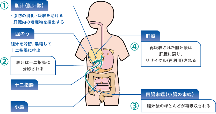 胆汁酸※は脂肪の消化・吸収を助けた後、ほとんどが回腸末端(小腸の末端)で再吸収(③)され、肝臓に戻りリサイクル(再利用)されます(④)。